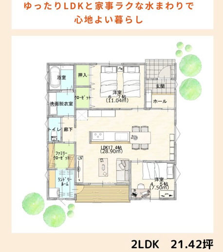 ゆったり LDKと家事ラクな水まわりで、心地よく暮らす、2LDK 21.42坪